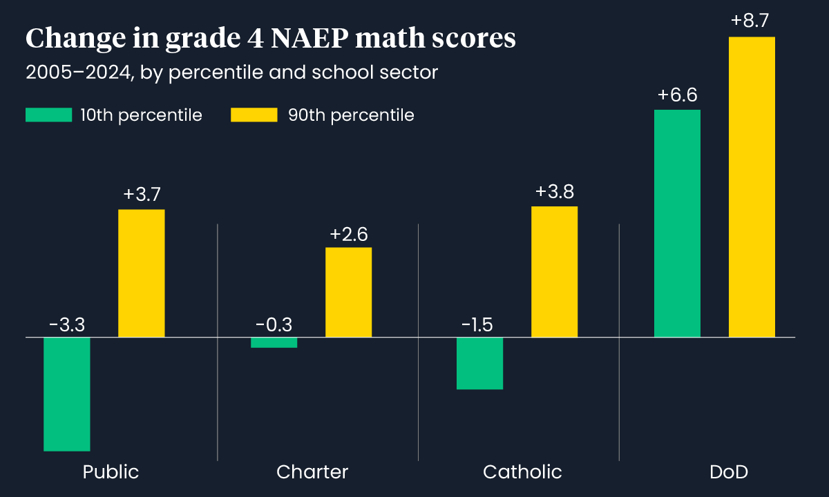 The 74, an outlet funded largely by mid-aughts school reform types, has an article reporting on a paper about the growing gap between the 90th percentile of students and the 10th percentile of students. The general gist of the problem is that kids ranked in the bottom 10th percentile of students (90% of students do better than these kids) are losing ground on the NAEP as the years go by while the top 10% of students (90% of students do worse than these kids) are improving. One of the interesting things about this data is that they break out charter schools, Catholic schools (that choose to participate in NAEP), and the Department of Defense Schools. The 74 brings us this graph.