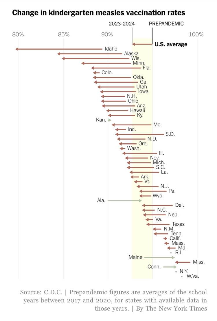 Speaking of problems with long-term consequences: childhood vaccination rates are falling. This is, actually, very closely related to one of the points I made last week. Human capital includes the health of the workforce. A sicker population is not just a less educated one (as the article points out), it’s also just plain sicker. My kiddo was sent home with a fever last Friday. Turns out she had the flu. Because she was vaccinated, her course of illness was less severe and shorter than it otherwise might have been. She could have gone back sooner except for some rules about how long after a fever kids have to stay home. I would prefer kids are less sick. I would prefer to be sick less often and with less severity. Sadly, that’s not the world we’re headed towards.
