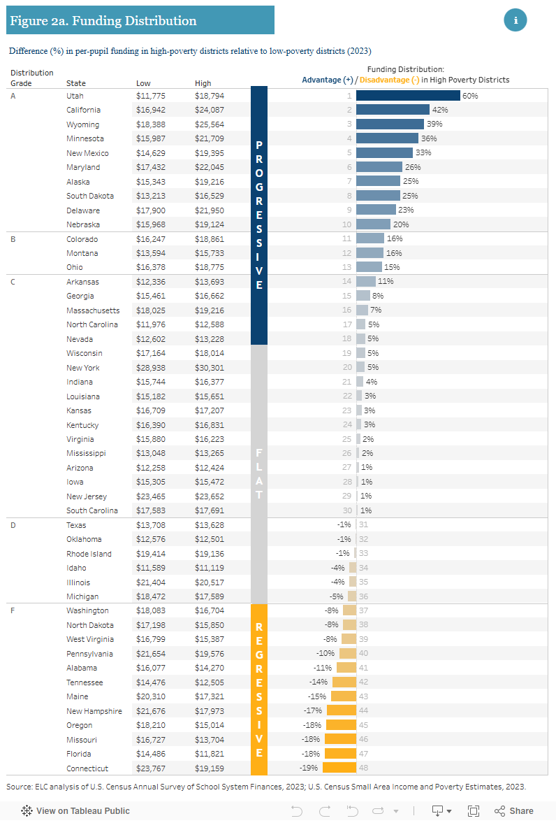 Via Peter Green, I saw an interesting report about which states provide the most equitable school funding. Most of the time when we talk about school funding, we focus on a flat per-pupil headline number. New York spends the most per pupil at $29,440 (“cost adjusted”) and states like Idaho and North Carolina spend the least at $11-12,000 (again, “cost adjusted”). These are numbers policymakers and commentators are very used to and they tell one kind of story, usually one about “value for your money” or “ROI”. And, usually, what happens is you find out that traditionally blue states spend a lot per pupil and red states spend little per pupil. But, what gets really interesting in this report is the analysis of which districts get additional funding. The idea being, poor school districts face greater challenges, so they require additional resources. When looked at this way, the list of top and bottom states shifts and defies convenient (lazy) political narratives.