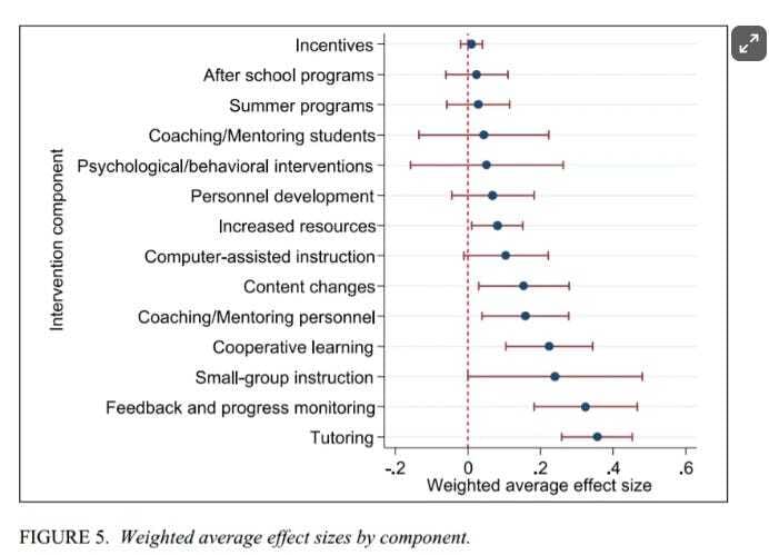 My only quibble is that Demming argues personalized learning and computer aided instruction are super effective. I disagree. In fact, I think it’s pretty clear that personalized learning is a bit of a chimera and we should be skeptical of claims about it. As far as computer aided instruction goes, I’m sure the one research group’s product, Mindspark, Demming pulls from is quite inspirational, but when you weigh the extant literature on CAI it’s not great. Not awful, but not great. Middle of the pack, in fact. Actual tutoring was far better than CAI. So are cooperative learning, small group instruction, and metacognitive approaches like feedback and progress monitoring.