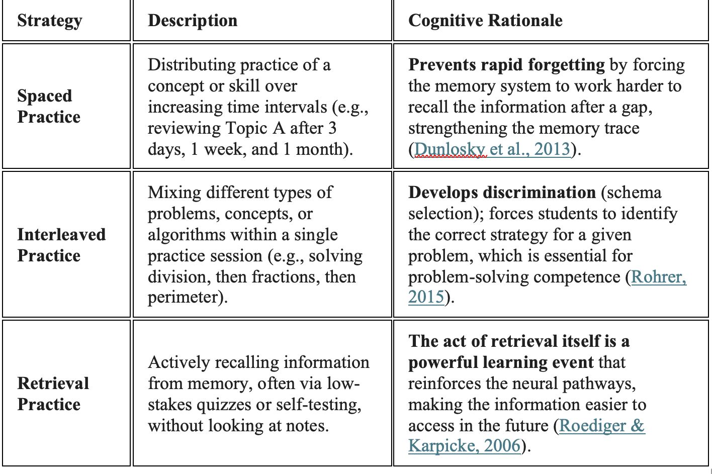 Anyway, I think the post is concise and makes the case that when learning the foundational stuff, kids need to be able to focus their cognitive resources on the actual math to be learned and less on the inquiry. While I worry that the science of learning folks may find their approaches are misunderstood or taken too far (SoL rockstar Carl Hendrick is also worried about this, by the way), I still think schools and learners are better off in a world where teachers and schools are thinking about SoL concepts. Toward that end, here are a pair of charts from Diamond’s post that might be useful.