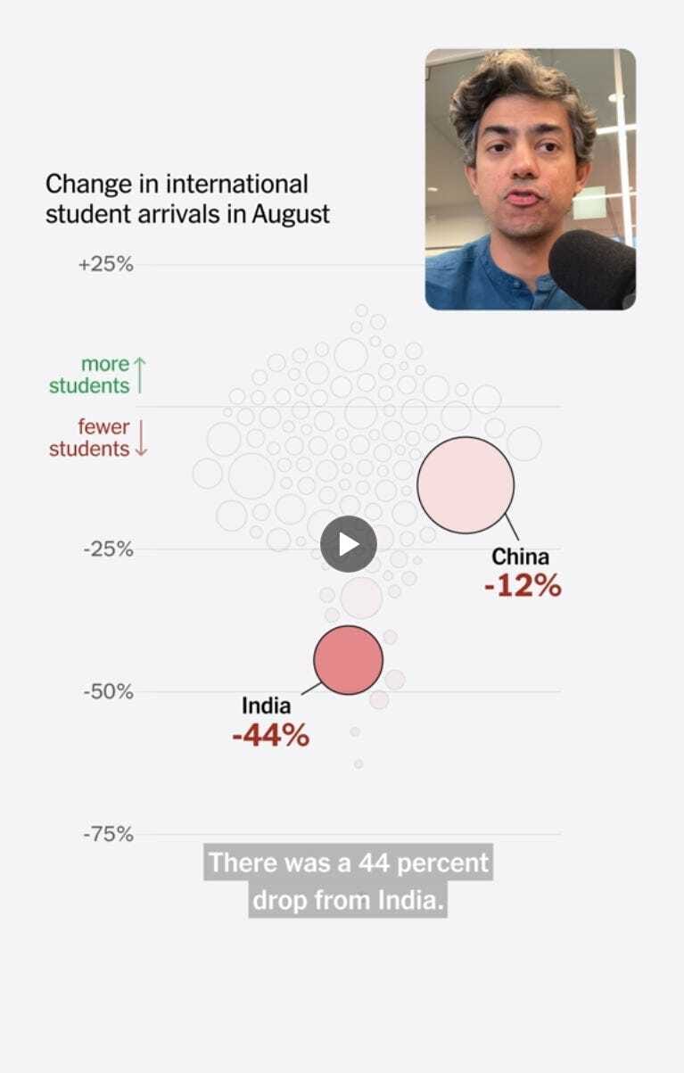 The NYT has a quick video charting the decline in international students attending US colleges and universities. (Accompanying article) Notably, about half of all international students in the US come from China and India, the two countries with the largest drop.